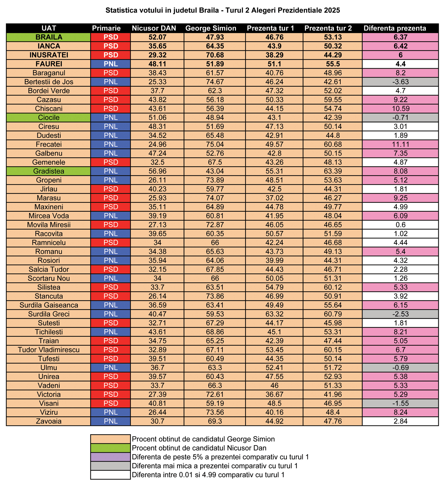 Că înțelegerea tandemului Simion – Cîrligea a fost cu liberalii, comandați de Alexandru Popa și nu cu PSD o demonstrează faptul că în municipiul Brăila, condus de administrația Dragomir, independentul Nicușor Dan s-a clasat pe locul I cu 52,07%. În tabelul alăturat puteți vedea cum s-a votat în comunele din județ și cum a variat prezența la vot între cele două tururi.