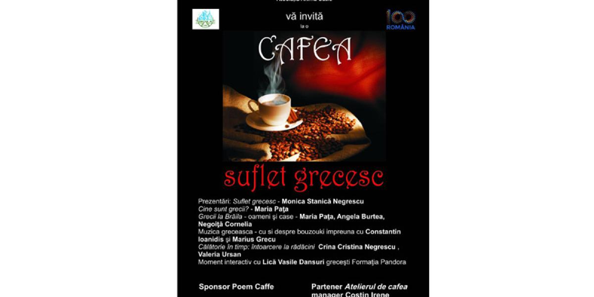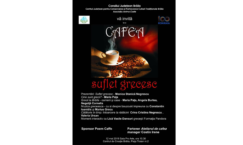 “Cu acest laitmotiv - la o cafea cu suflet grecesc şi cu admiraţia faţă de frumoasa Elada, Centrul Judeţean pentru Conservarea şi Promovarea Culturii Brăila vă aşteaptă să gustaţi o cafea cu specific mediteranean şi să redescoperiţi tradiţii şi obiceiuri menite să aducă bucurie în sufletele iubitorilor culturii elene”, ne-a transmis Maria Puşcaciu, adăugând că din program nu vor lipsi momentele muzicale - bouzouki şi dansurile tradiţionale.