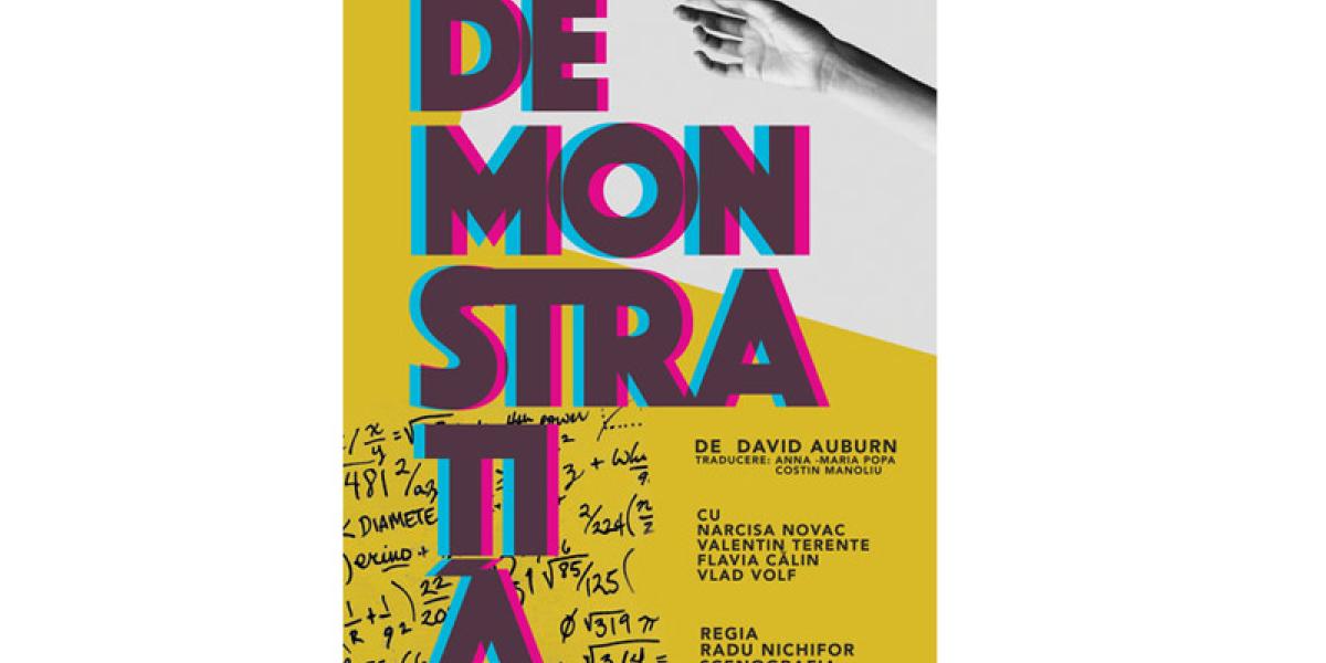 Piesă a scriitorului american contemporan David Auburn, DEMONSTRAŢIA este un spectacol montat în spaţiul Sălii Studio (Bujor Macrin), de regizorul Radu Nichifor, un text câştigător al Premiului Pulitzer în anul 2001, o piesă care a avut parte de un spectacol cu o mie de reprezentaţii pe Broadway, dar şi de o ecranizare, în 2005, cu o distribuţie de excepţie – Gwyneth Paltrow, Anthony Hopkins, Jake Gyllenhaal.