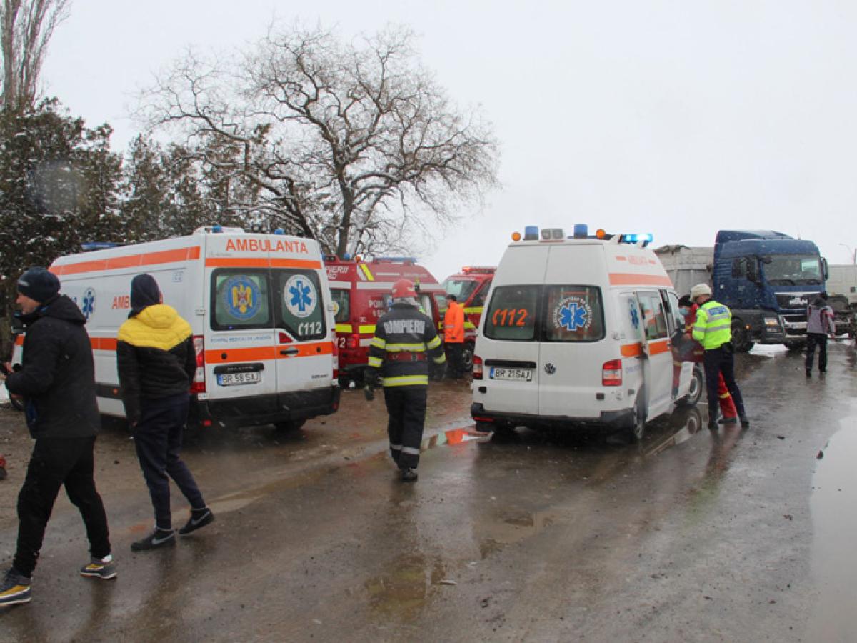 * un eveniment grav a avut loc, ieri dimineață, la trecerea la nivel cu calea ferată din dreptul localității Baldovinești * o autobasculantă condusă de un șofer gălățean a fost lovită de trenul care se deplasa pe sensul Brăila - Galați, șoferul motivând că nu ar fi observat semnalele luminoase și acustice * au rezultat cinci victime, fiind vorba despre două persoane aflate în tren și muncitori care lucrau afară și au fost loviți de pietrele din basculantă * potrivit ISU, victimele erau toate conștiente și fără leziuni majore * Ispecția Muncii a stabilit că accidentul a fost provocat de șoferul autovehiculului
