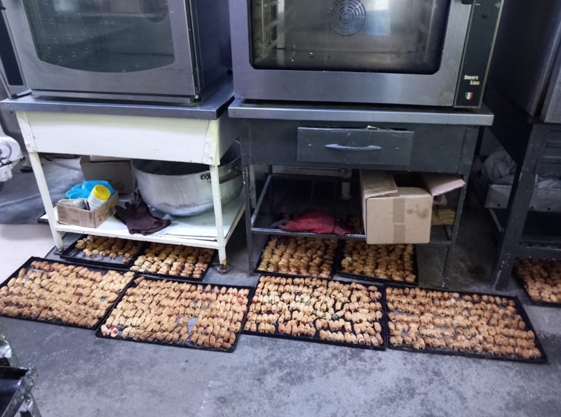 - folosirea în etapele preliminare ale procesului tehnologic a ustensilor neprofesionale (cuțite cu mâner din lemn și nituri de prindere, răzătoare cu rugină, sucitoare și linguri din lemn, bucăți de plastic provenite din găleți folosite pe post de gripcă); veselă neigienizată cu grad avansat de deteriorare; reutilizarea ambalajelor din plastic provenite de la alte materii prime pentru depozitarea semifabricatelor din categoria cremelor; tăvile folosite pentru coacerea produselor finite prezentau un grad avansat de uzură, fiind insuficient igienizate, iar stratul protector al tăvilor era deteriorat;
