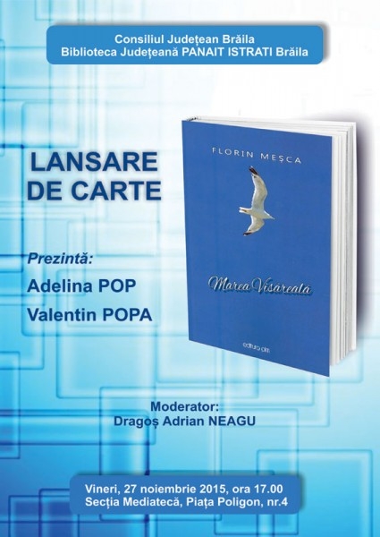 Vineri, 27 noiembrie, ora 17.00, la Biblioteca Judeţeană "Panait Istrati" are loc lansarea romanului „Marea visăreală" de Florin Meşca, eveniment prezentat de scriitoarea Adelina Pop şi prof. Valentin Popa şi moderat de Dragoş Adrian Neagu, directorul instituţiei gazdă.