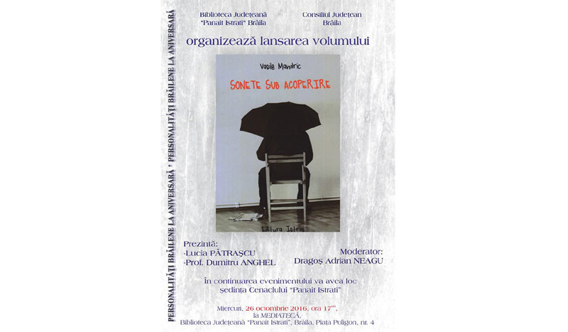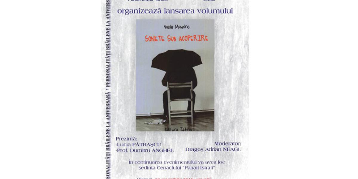 Miercuri, 26 octombrie 2016, ora 17.00, la Biblioteca Judeţeană “Panait Istrati” Brăila are loc lansarea cărţii „Sonete sub acoperire” semnată de Vasile Mandric.