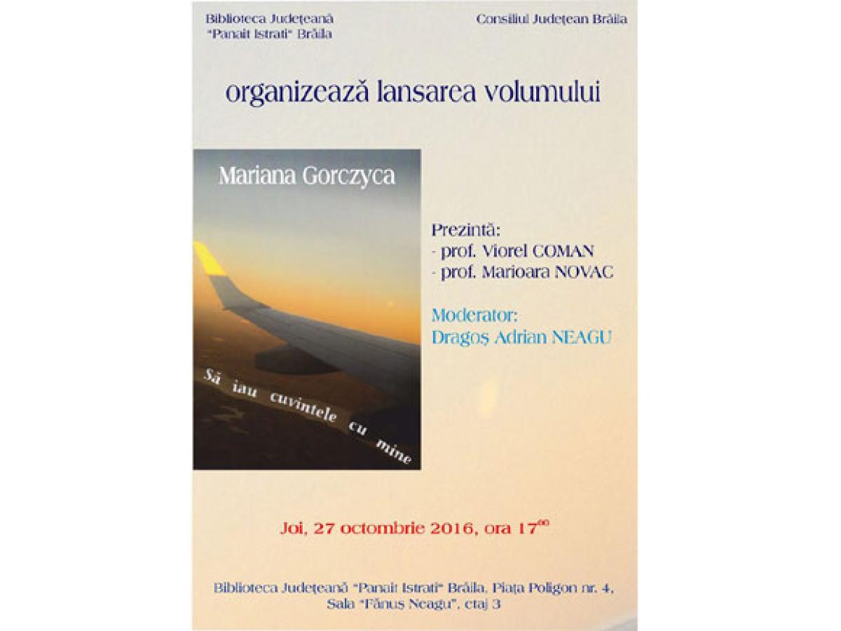 Joi, 27 octombrie, ora 17.00, tot la Biblioteca Judeţeană va avea loc lansarea cărţii „Să iau cuvintele cu mine”, semnată de Mariana Gorczyca, invitaţi să prezinte cartea fiind scriitorul Viorel Coman şi prof. Marioara Novac.