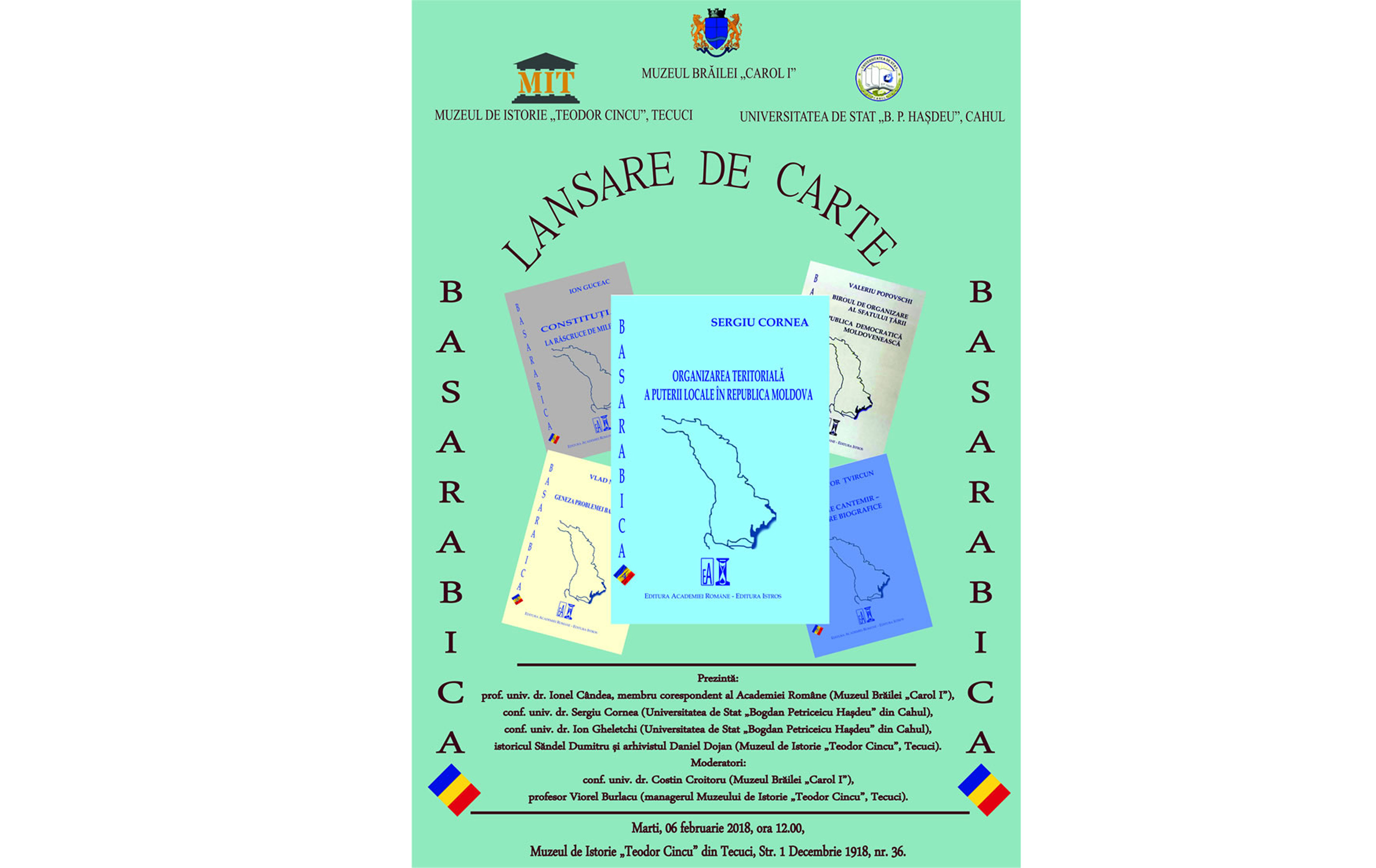Astăzi, 6 februarie, de la ora 12,00 la sediul Muzeului de Istorie “Teodor Cincu” din Tecuci are loc lansarea a cinci volume apărute în Colecţia “Basarabica”, la Editura Academiei Române şi la Editura “Istros” a Muzeului Brăilei “Carol I”. Evenimentul este organizat de Muzeul Brăilei “Carol I”, în colaborare cu Muzeul de Istorie “Teodor Cincu” din Tecuci şi Universitatea “Bogdan Petriceicu Haşdeu” din Cahul -Republica Moldova.