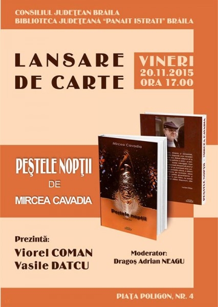 Biblioteca Judeţeană „Panait Istrati" Brăila organizează vineri, 20 noiembrie, ora 17.00, lansarea volumului „Peştele nopţii" de Mircea Cavadia, eveniment prezentat de scriitorii Viorel Coman şi Vasile Datcu şi moderat de Dragoş Adrian Neagu, directorul bibliotecii.