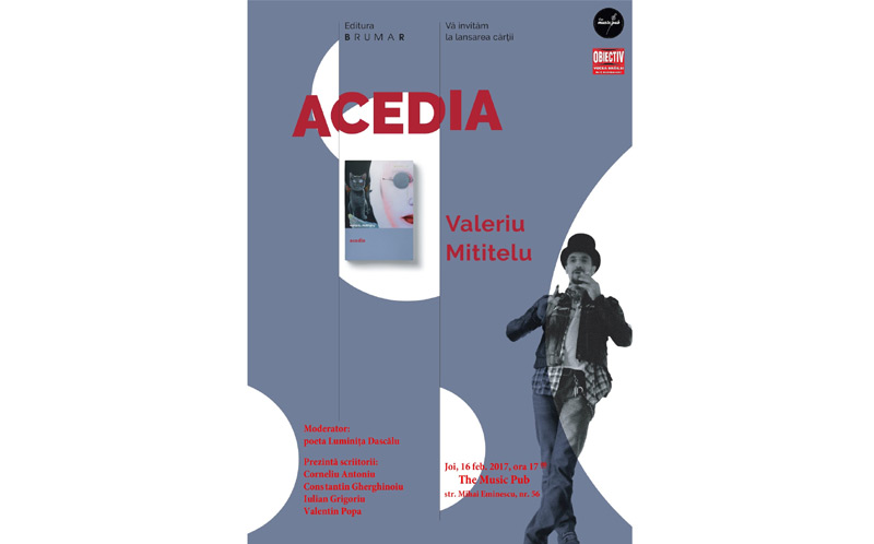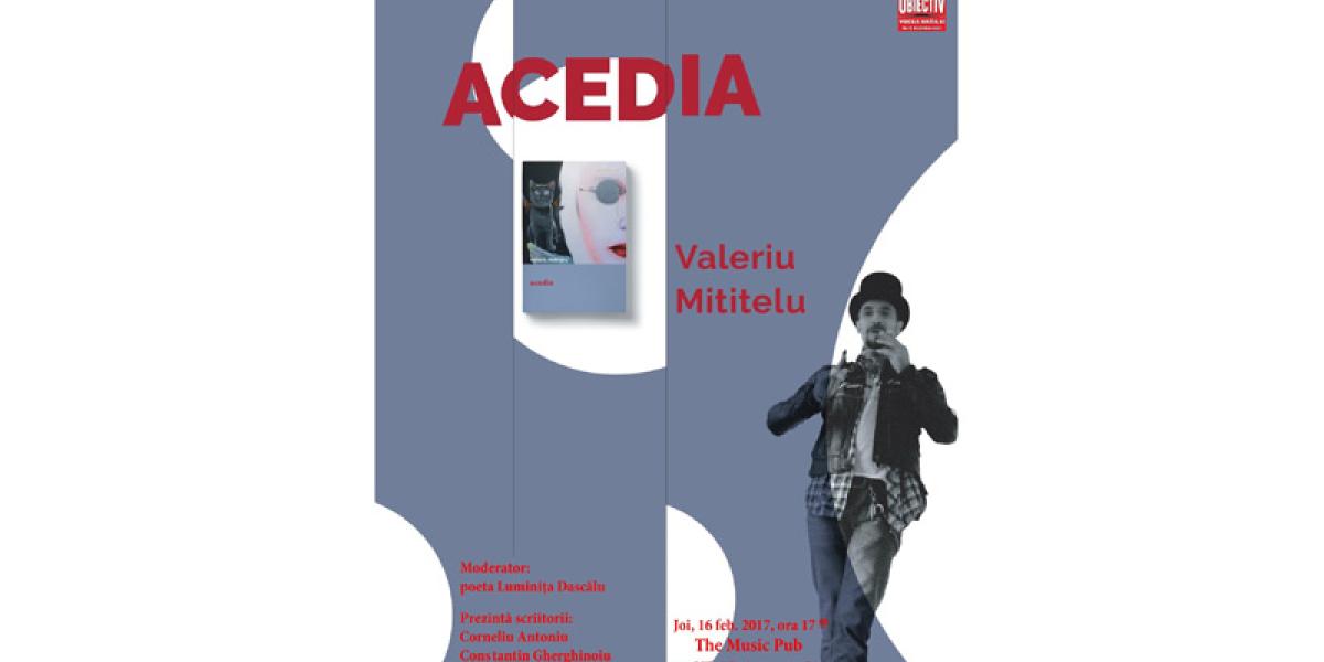 Joi, 16 februarie 2017, de la ora 17.00, la THE MUSIC PUB din Str. Mihai Eminescu, nr. 56 are loc lansarea cărţii ACEDIA, semnată de Valeriu Mititelu şi apărută la editura Brumar. Moderator al evenimentului cultural este poeta Luminiţa Dascălu, iar cartea va fi prezentată de poetul Corneliu Antoniu- preşedinte al USR Galaţi-Brăila, scriitorul Constantin Gherghinoiu, scriitorul Iulian Grigoriu şi scriitorul Valentin Popa.