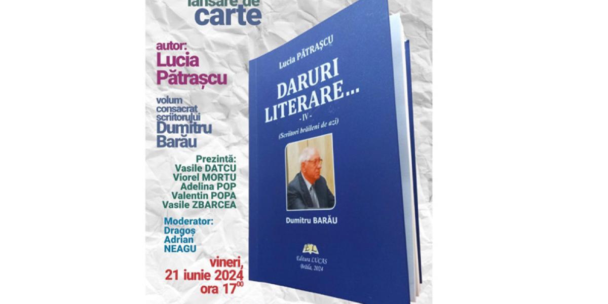 Biblioteca Județeană ”Panait Istrati” Brăila organizează astăzi, 21 iunie 2024, începând cu ora 17.00, o întâlnire literară specială. Este vorba despre lansarea cărții ”Daruri literare - IV - Scriitori brăileni de azi - Dumitru Barău” de Lucia Pătrașcu. Evenimentul are loc la Sala ”Fănuș Neagu” și va fi prezentat de Vasile Datcu, Viorel Mortu, Adelina Pop, Valentin Popa, Vasile Zbarcea. Moderează: Dragoș Adrian Neagu, directorul bibliotecii.