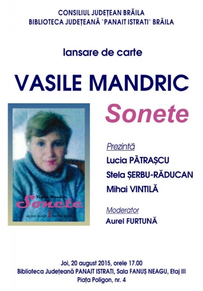 Biblioteca Judeţeană "Panait Istrati" Brăila a găzduit, ieri, lansarea volumului "Sonete", semnat de Vasile Mandric. Evenimentul a avut loc la sala "Fănuş Neagu", de la etajul lll al clădirii din Piaţa Poligon şi a fost moderat de Aurel Furtună. Au susţinut alocuţiuni critice Lucia Pătraşcu, Stela Şerban-Răducan şi Mihai Vintilă. Cunoscut publicului cititor din Brăila ca epigramist şi poet, Vasile Mandric este autorul volumelor "Eli lama sabactani", publicat în 2000 şi "Spaţiu răsturnat", publicat în 2014.