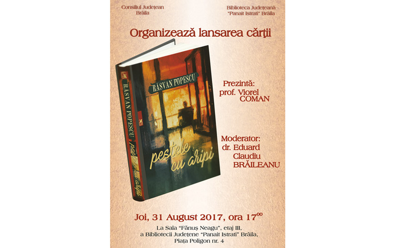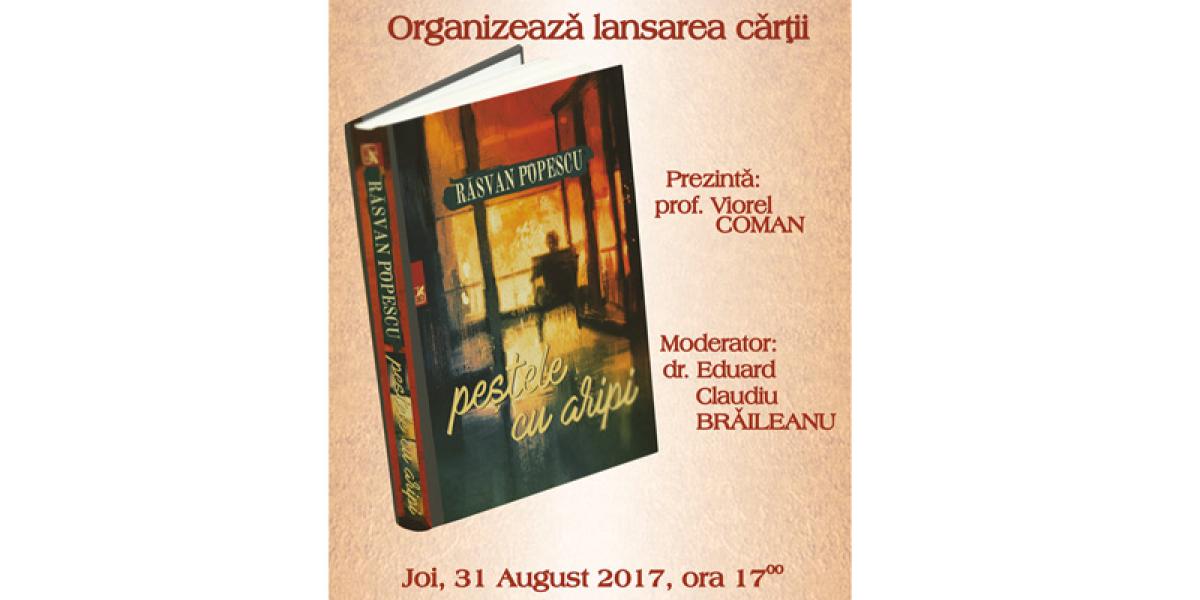 Joi, 31 august, ora 17.00, la Biblioteca Judeţeană “Panait Istrati” din Brăila va avea loc lansarea volumul “Peştele cu aripi”, semnat de jurnalistul şi scriitorul Răsvan Popescu şi apărut la Editura Cartea Românească. Evenimentul, care se va desfăşura la Sala “Fănuş Neagu”, va fi prezentat de profesor Viorel Coman şi moderat de dr. Claudiu Eduard Brăileanu.