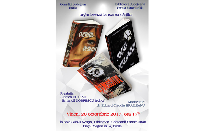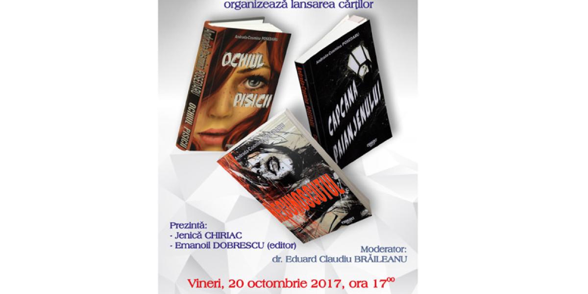 Vineri, 20 octombrie 2017, ora 17.00, la Sala “Fănuş Neagu” a Bibliotecii Judeţene “Panait Istrati” din Piaţa Poligon nr. 4 va avea loc lansarea cărţilor “Ochiul pisicii”, “Capcana păianjenului” şi “Necunoscutul”, ale tinerei autoare Andrada-Cosmina Posedaru.