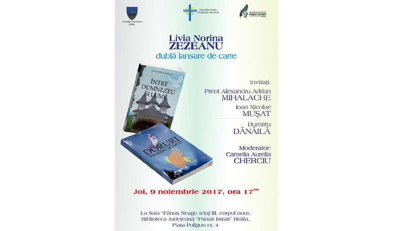 Joi, 9 noiembrie, ora 17.00, la Biblioteca Judeţeană “Panait Istrati “ va avea loc lansarea cărţilor “Între Dumnezeu şi lume” şi “Doruri din adânc de suflet”, semnate de Livia Norina Zezeanu. Invitaţi să prezinte cărţile sunt: preot Alexandru Adrian Mihalache şi scriitorii Ivan Niculae Muşat şi Dumitru Dănăilă, evenimentul fiind moderat de bibliotecar Camelia Aurelia Cherciu.