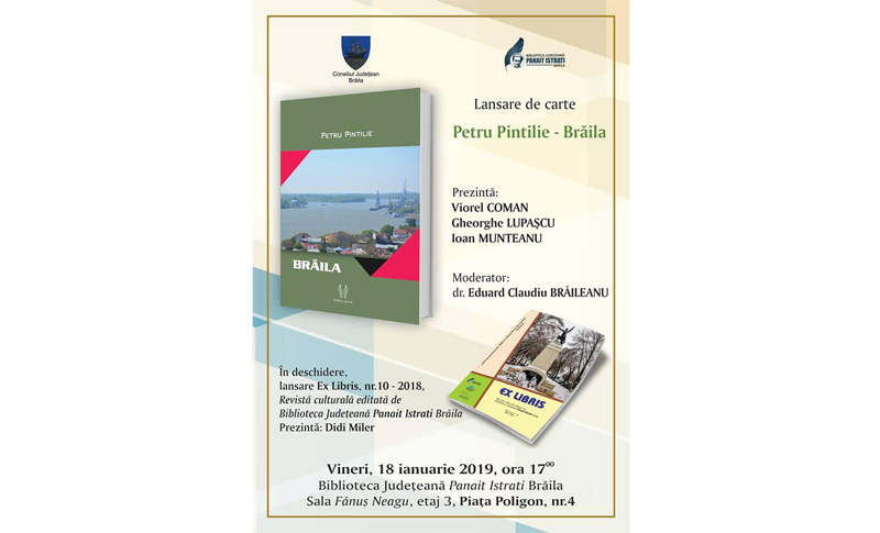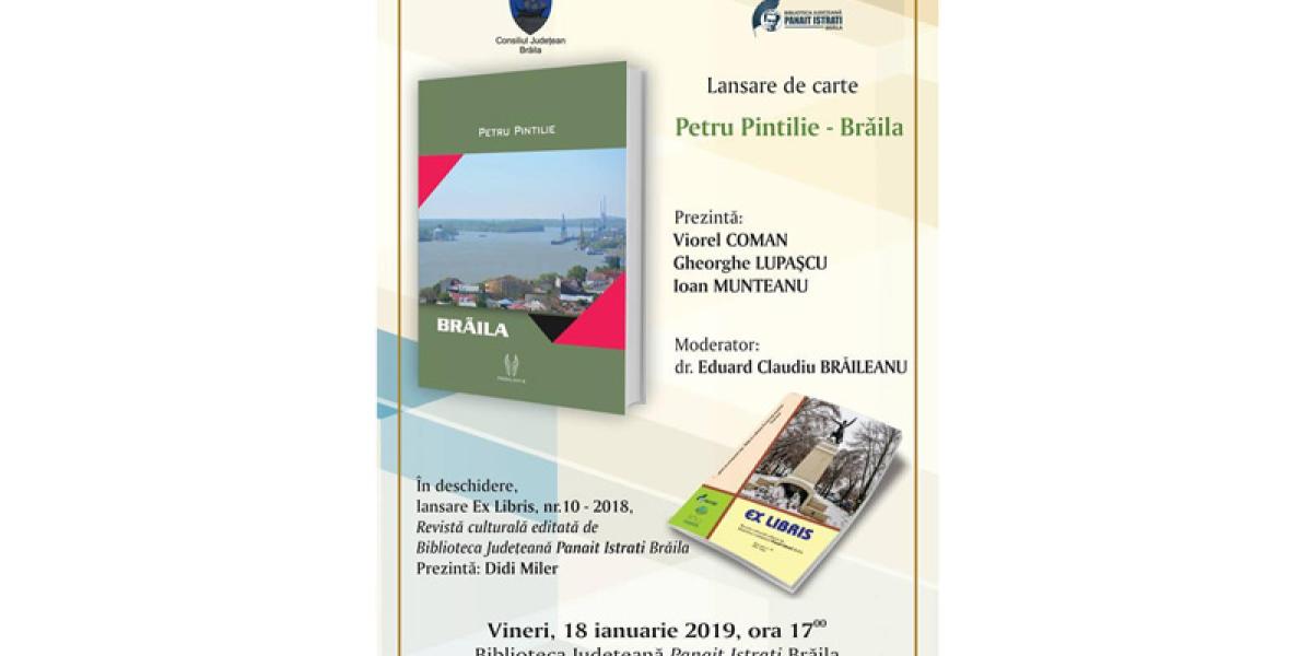 Vineri, 18 ianuarie 2019, de la ora 17.00, la Biblioteca Judeţeană “Panait Istrati”, sala “Fănuş Neagu” va avea loc lansarea cărţii “Brăila” de Petru Pintilie, ediţie alcătuită şi îngrijită de Viorel Coman. Evenimentul va fi prezentat de Viorel Coman, Gheorghe Lupaşcu şi Ioan Munteanu şi moderat de dr. Eduard Claudiu Brăileanu.