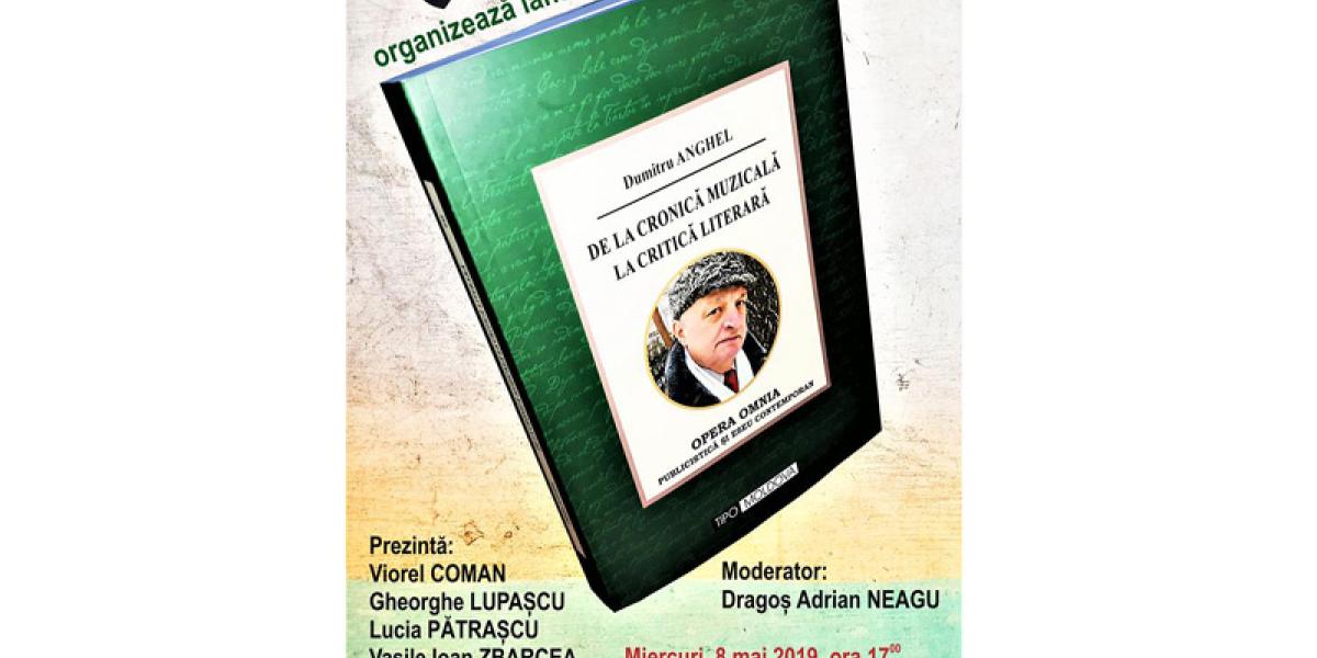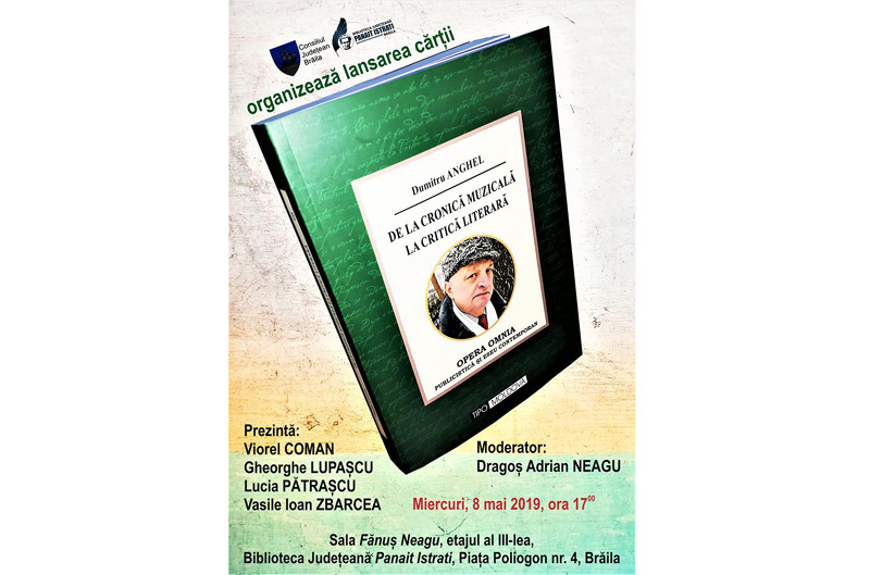 Miercuri, 8 mai 2019, ora 17.00, la Biblioteca Judeţeană “Panait Istrati” Brăila, Sala “Fănuş Neagu”, are loc lansarea volumului OPERA OMNIA “De la cronică muzicală la critică literară” - publicistică şi eseuri contemporane scrise de Dumitru Anghel. Evenimentul va fi prezentat de scriitorii Viorel Coman, Gheorghe Lupaşcu, Lucia Pătraşcu şi prof. Vasile Ioan Zbarcea şi moderat de Dragoş Adrian Neagu, directorul instituţiei gazdă.