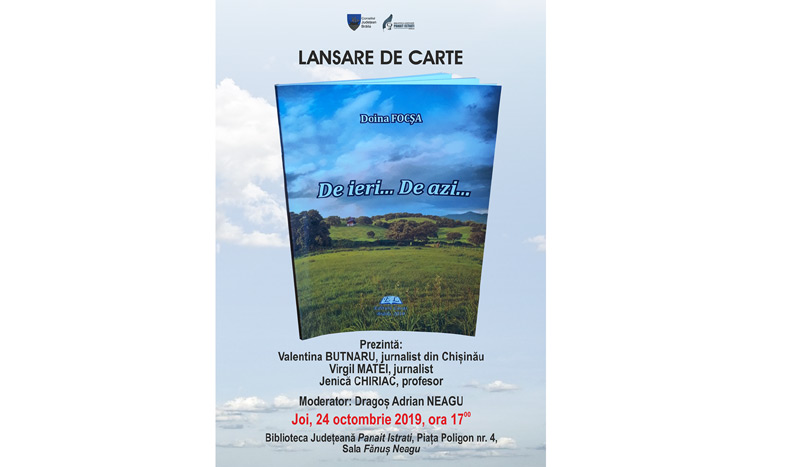 Joi, 24 octombrie, ora 17.00, la Biblioteca Judeţeană “Panait Istrati”, sala “Fănuş Neagu”, are loc lansarea cărţii “De ieri… De azi”, semnată de Doina Focşa. Evenimentul va fi prezentat de Valentina Butnaru, jurnalist din Chişinău, Vergil Matei, jurnalist, şi Jenică Chiriac, profesor. Moderator va fi Dragoş Adrian Neagu, directorul bibliotecii.