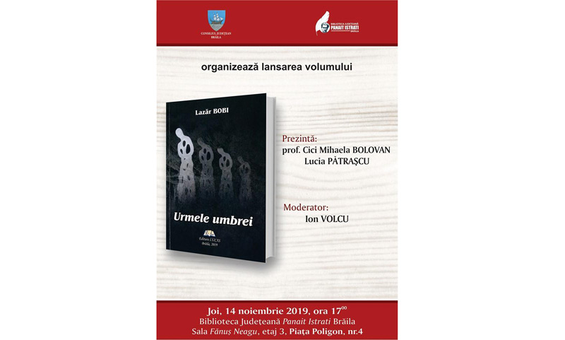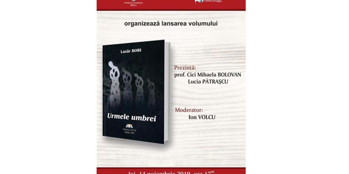 Joi, 14 noiembrie 2019, de la ora 17.00, la Biblioteca Judeţeană “Panait Istrati “, sala “Fănuş Neagu”, va avea loc lansarea volumului de poezie “Urmele umbrei”, de Lazăr Bobi. Evenimentul va fi prezentat de profesor Cici Mihaela Bolovan şi scriitoarea Lucia Pătraşcu şi moderat de Ion Volcu, şef birou în cadrul instituţiei gazdă.