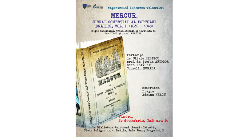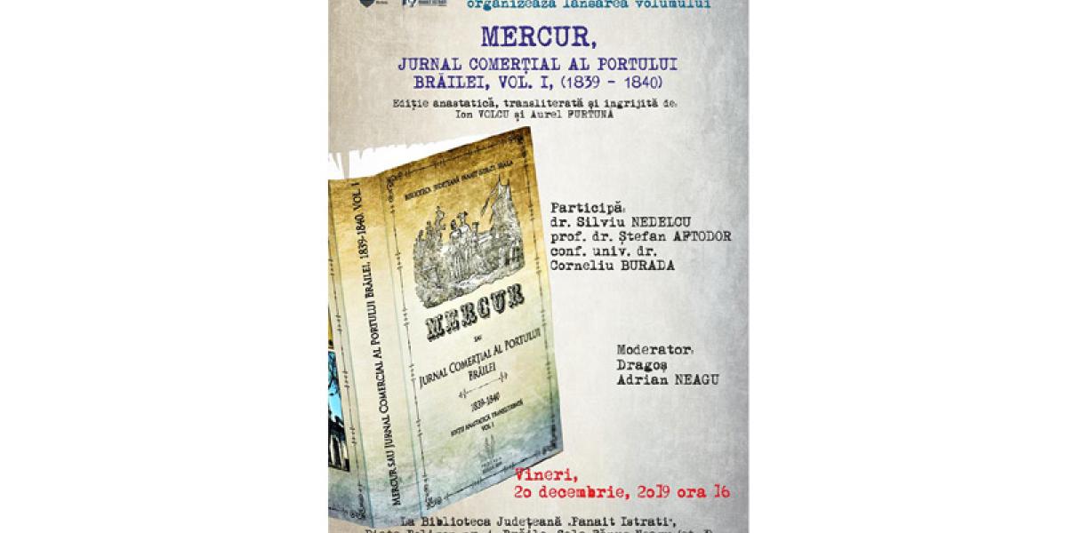 Vineri, 20 decembrie 2019, ora 16.00, la Biblioteca Judeţeană “Panait Istrati”, sala “Fănuş Neagu” va avea loc lansarea volumului “Mercur sau Jurnal Comercial al Portului Brăilei, 1839-1840”, ediţie anastatică, transliterată şi îngrijită de Ion Volcu şi Aurel Furtună.