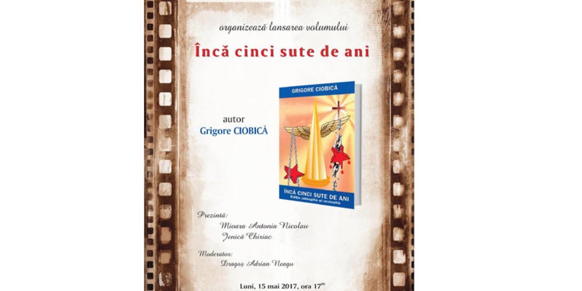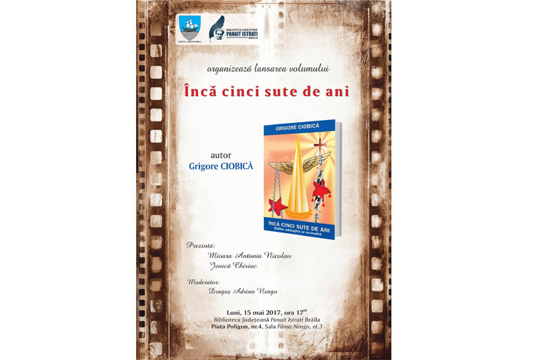Luni, 15 mai, de la ora 17.00, la Sala “Fănuş Neagu” a Bibliotecii Judeţene “Panait Istrati” va avea loc lansarea volumului “Încă cinci sute de ani”, semnat de Grigore Ciobică. Evenimentul va fi prezentat de Mioara Antonia Nicolau, alias Anthonia Amatti, şi Jenică Chiriac şi moderat de Dragoş Adrian Neagu, directorul bibliotecii.