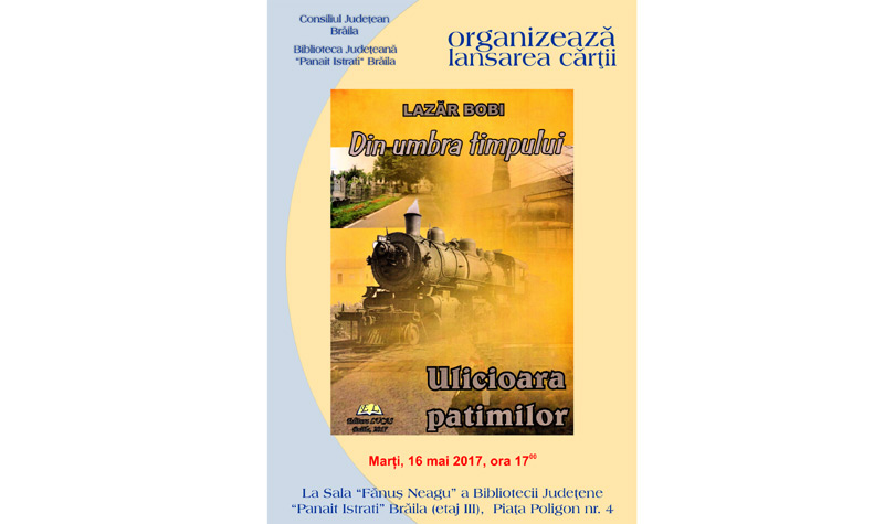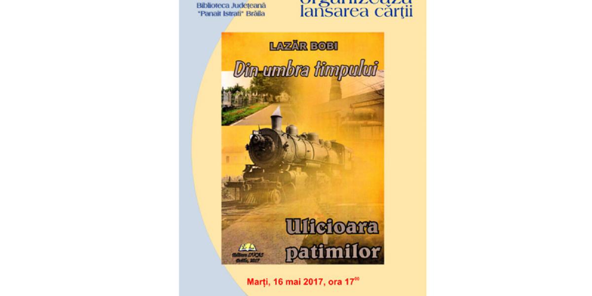 Marţi, 16 mai 2017, de la ora 17.00, la Sala “Fănuş Neagu” din cadrul Bibliotecii Judeţene “Panait Istrati” va avea loc lansarea romanului “Din umbra timpului”, vol. 1, semnat de Lazăr Bobi.