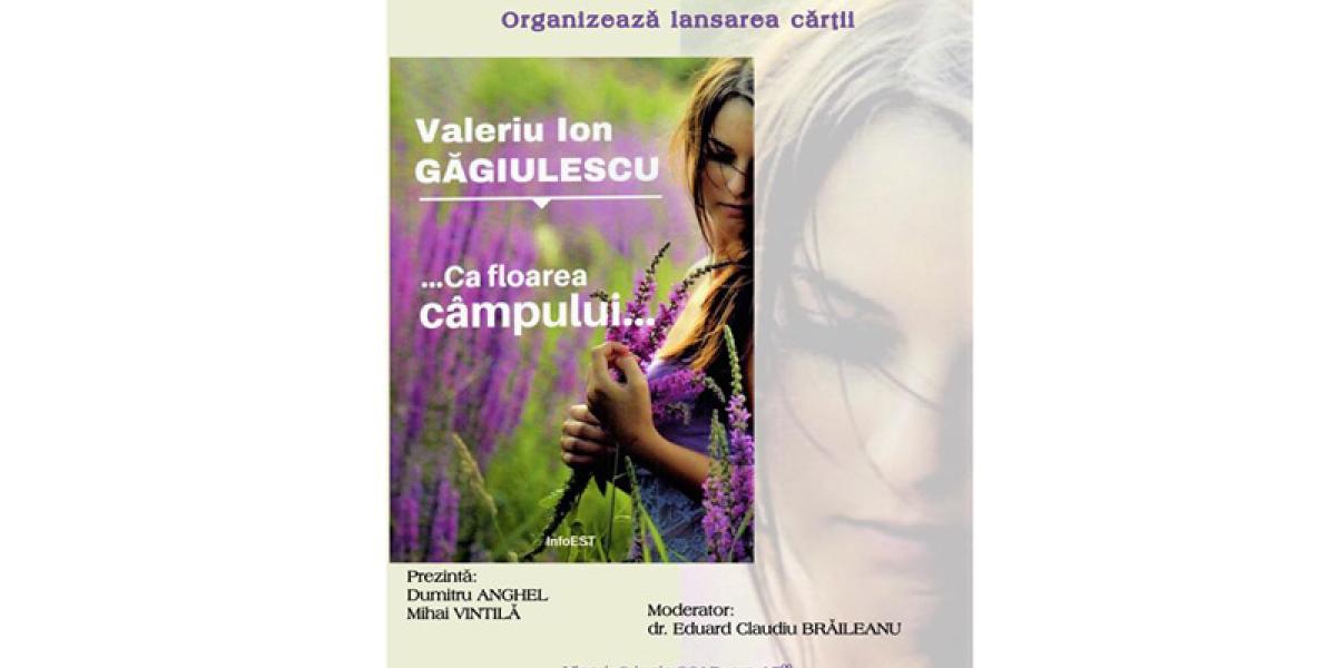 Vineri, 9 iunie, ora 17.00, la Biblioteca Judeţeană “Panait Istrati” Brăila va avea loc lansarea cărţii “… Ca floarea câmpului…” semnată de Valeriu Ion Găgiulescu. Romanul este prezentat de scriitorul Alexandru Halupa şi jurnalistul Mihai Vintilă, iar evenimentul are loc la Secţia Mediatecă şi este moderat dr. Eduard Claudiu Brăileanu, şef serviciu în cadrul Bibliotecii.