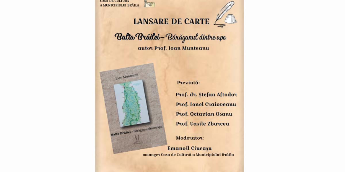 Eveniment editorial la Brăila. Joi, 11 ianuarie 2024, începând cu ora 17.00, la sediul Casei de Cultură a Municipiului Brăila (Casa Memorială „Petre Ștefănescu-Goangă”, din Piața Poligon nr. 2), va avea loc lansarea cărții „Balta Brăilei - Bărăganul dintre ape”, semnată de profesorul Ioan Munteanu, un erudit al condeiului.