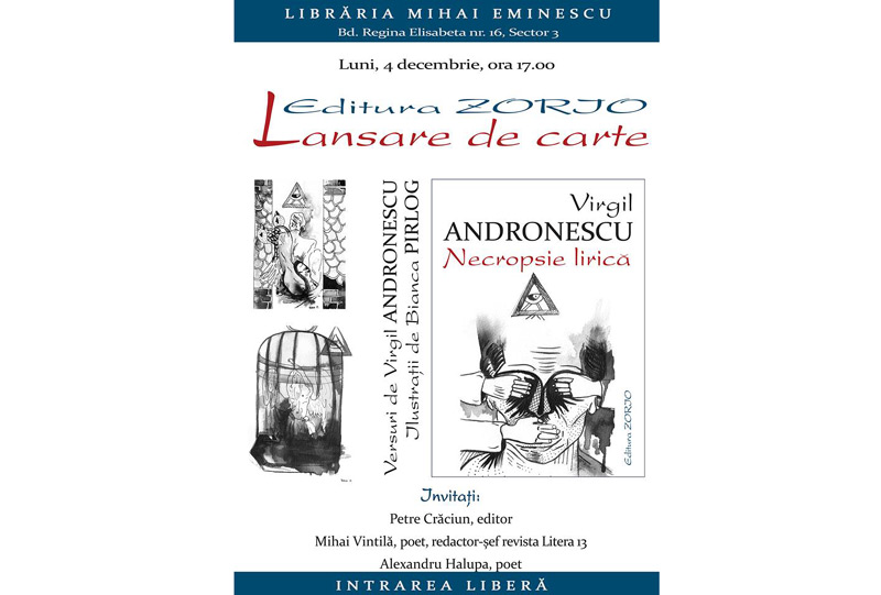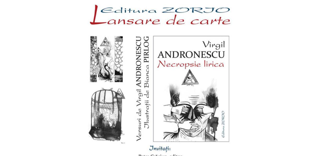 Miercuri, 6 decembrie 2017, de la ora 16.30, la Casa de Ajutor Reciproc a Pensionarilor “Ana Aslan” Brăila, din strada Nicolae Bălcescu numărul 10 va avea loc lansarea volumului de poezii “Necropsie lirică”, semnat de Virgil Andronescu. Cartea, cu ilustraţii realizate de Bianca Pîrlog, a apărut la editura “Zorio” din Bucureşti şi va fi prezentată în cadrul Cenaclului “Casa Speranţei” al C.AR.P. Brăila, după ce a fost lansată luni, 4 decembrie, la librăria “Mihai Eminescu” din capitală. Despre volumul de poezii vor vorbi Mihai Vintilă, redactor-şef al revistei Litera13, poetul Alexandru Halupa şi aforistul Zeno Halupa.