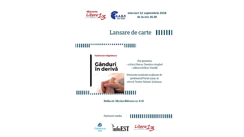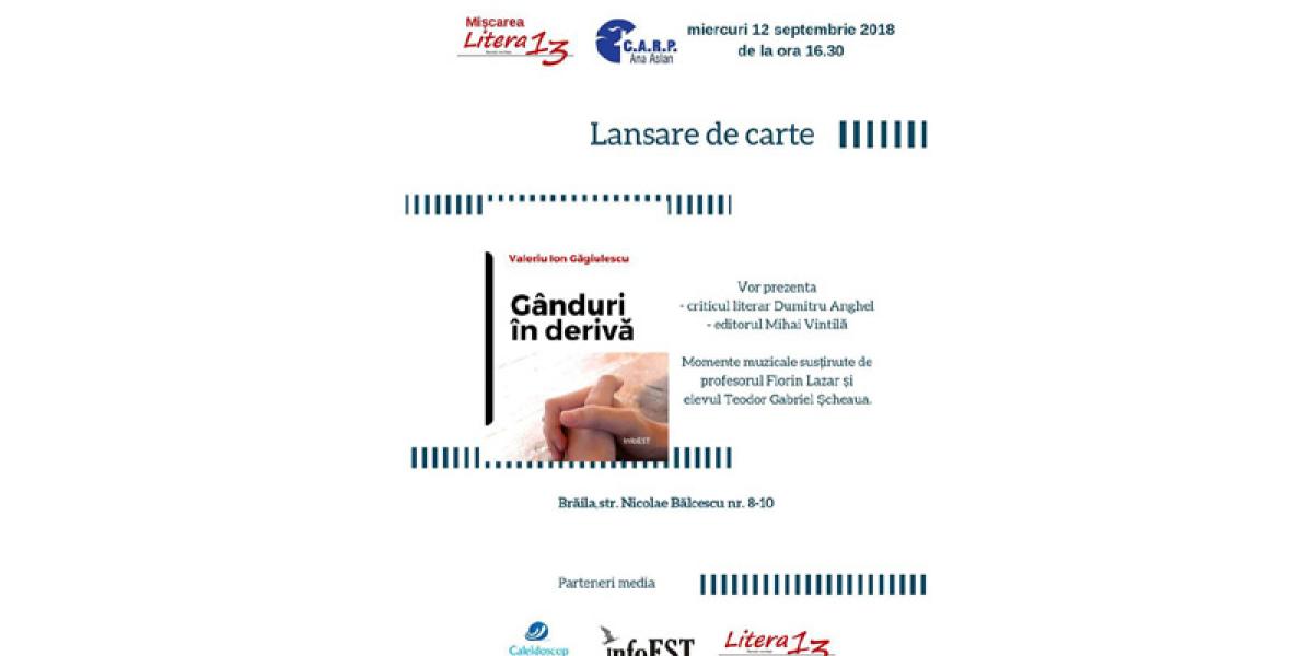 Astăzi, 12 septembrie, cu începere de la ora 16.30, în cadrul şedinţei cenaclului Casa Speranţei din cadrul Casei de Ajutor Reciproc a Pensionarilor “Ana Aslan” va avea loc lansarea volumului “Gânduri în derivă”, semnat de Valeriu Ion Găgiulescu.