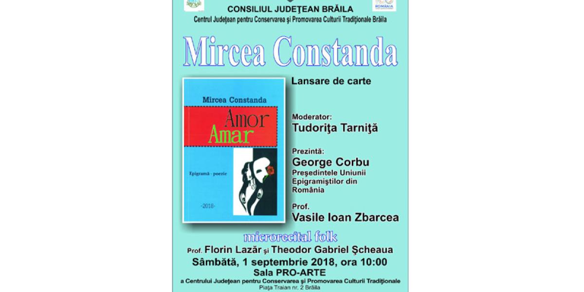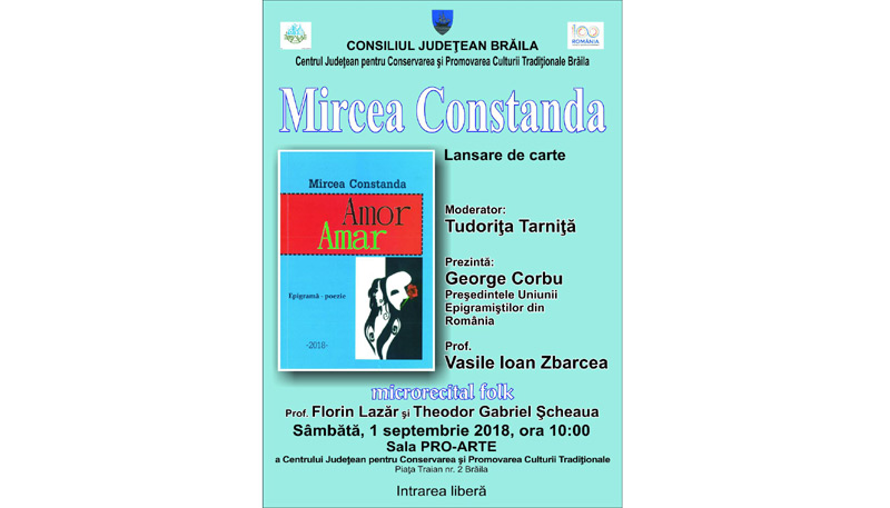 Sâmbătă, 1 septembrie 2018, ora 10.00, la Sala PRO-ARTE a Centrului de Creaţie Brăila, din Piaţa Traian nr. 2, va avea loc lansarea volumului de epigramă şi poezie “AMOR AMAR”, semnat de avocatul Mircea Constanda.