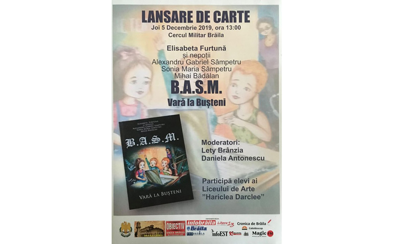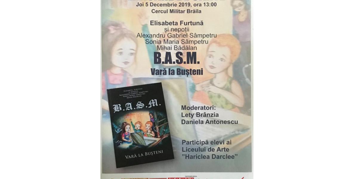 Joi, 5 decembrie 2019, de la ora 13.00, la Cercul Militar Brăila, în Ajun de Sfântul Nicolae, Facătorul de minuni şi Protectorul copiilor, va avea loc o lansare de carte inedită. Elisabeta Furtună şi nepoţii: Alexandru Gabriel Sâmpetru, Sonia Maria Sâmpetru şi Mihai Bădălan, sunt autorii cărţii “B.A.S.M. Vară la Buşteni”. “Un prilej de mare şi adevărată bucurie, fiindcă vom lansa cartea la care am lucrat mai bine de un an. V-o dăruim cu aceeaşi bucurie cu care am făcut-o noi, cei mici din vorbe şi fapte, iar Buni din cuvinte scrise. Noi scriam poveşti cu gândurile noastre făcându-le jocuri, Buni le transcria pe hârtie. Din joaca şi visele noastre s-a născut Cartea. Vă invităm în aventurile noastre! Vor putea fi şi ale voastre: copii, părinţi, bunici!”, spun autorii povestirilor.