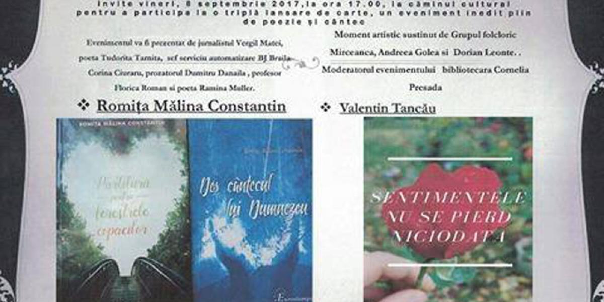 Vineri, 8 septembrie, de la ora 17.00, la Căminul Cultural din localitatea Mircea -Vodă va avea loc un eveniment de suflet, avându-i ca protagonişti pe Romiţa Mălina Constantin şi tânărul debutant Valentin Tancău, care îşi vor lansa volumele de poezii. Este vorba despre “Partitură pentru ferestrele copacilor” şi “Des cântecul lui Dumnezeu”, respectiv “Sentimentele nu se pierd niciodată”. Despre operele autorilor, la evenimentul cultural organizat de Primăria, Consiliul Local şi Biblioteca din Mircea Vodă şi moderat de Cornelia Presadă vor vorbi scriitorul Vergil Matei şi Tudoriţa Tarniţă, iar Andreea Maria, Dorian Leonte şi Grupul Vocal Mirceanca din Mircea-Vodă vor susţine momente artistice, de cântec şi poezie.
