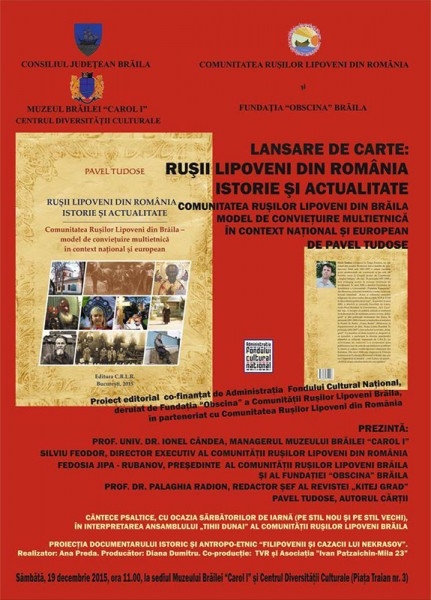 Sâmbătă, 19 decembrie, ora 11, la sediul Muzeului Brăilei „Carol I" şi Centrul Diversităţii Culturale din Piaţa Traian nr. 3 va avea loc lansarea cărţii "Ruşii lipoveni din România - Istorie şi actualitate. Comunitatea ruşilor lipoveni din Brăila -model de convieţuire multietnică în context naţional şi european, de Pavel Tudose.