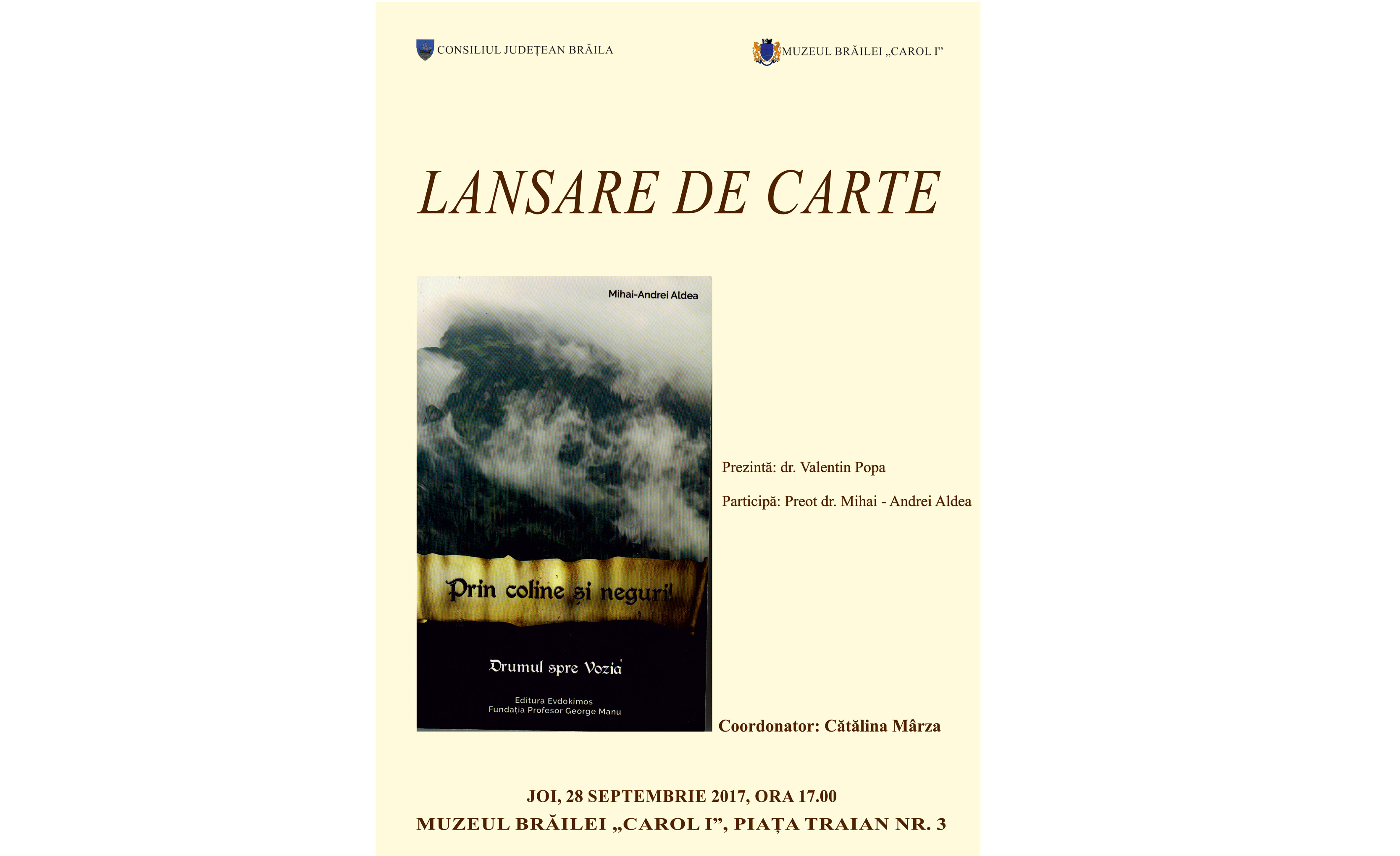 Joi, 28 septembrie 2017, ora 17, în sala de festivităţi a Muzeului Brăilei “Carol l” va avea loc lansarea cărţii “Drumul spre Vozia/ Partea a III-a / Prin coline şi neguri!”, avându-l ca autor pe preot dr. Mihai-Andrei Aldea.