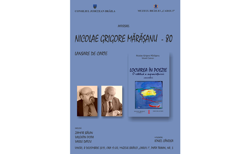 Vineri, 8 decembrie 2017, ora 17,00, în sala de festivităţi a Muzeului de Istorie “Carol l” din Piaţa Traian, nr. 3 va avea loc lansarea cărţii “Locuirea în poezie. O estetică a supravieţuirii/ convorbiri”. Cartea a apărut la Editura Istros a Muzeului Brăilei “Carol I” şi îi are ca autori pe Nicolae Grigore Mărăşanu şi Viorel Coman.