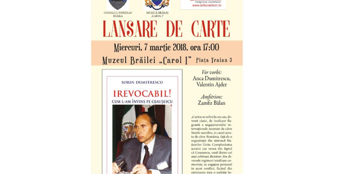 Miercuri, 7 martie 2018, ora 17,00, la sediul Muzeului de Istorie “Carol l” din Piaţa Traian nr. 3 va avea loc lansarea cărţii: IREVOCABIL!/ CUM L-AM ÎNVINS PE CEAUŞESCU, de Sorin Dumitrescu, apărută la Editura EIKON. Evenimentul va fi prezentat Anca Dumitrescu şi Valentin Ajder şi moderat de Zamfir Bălan.