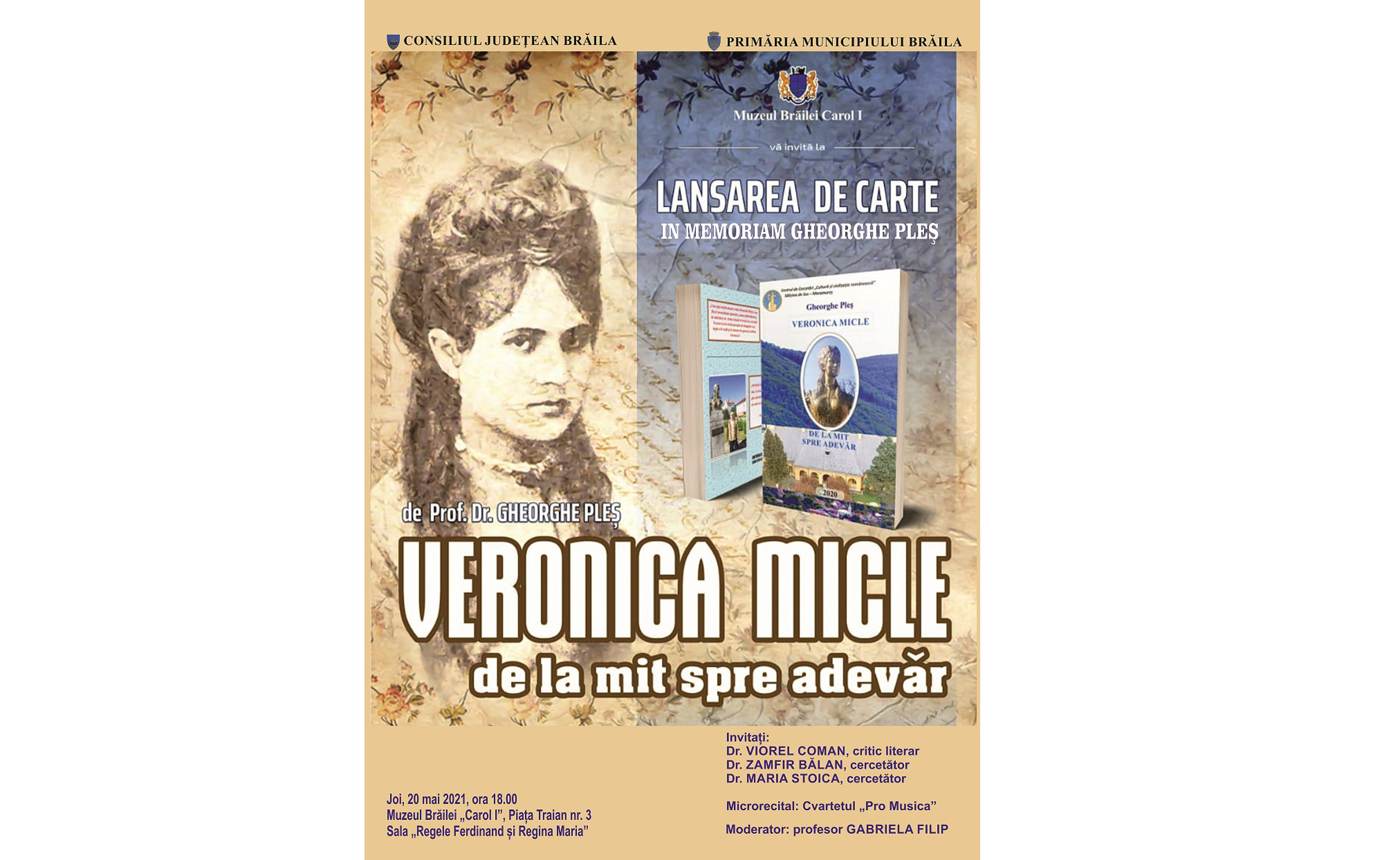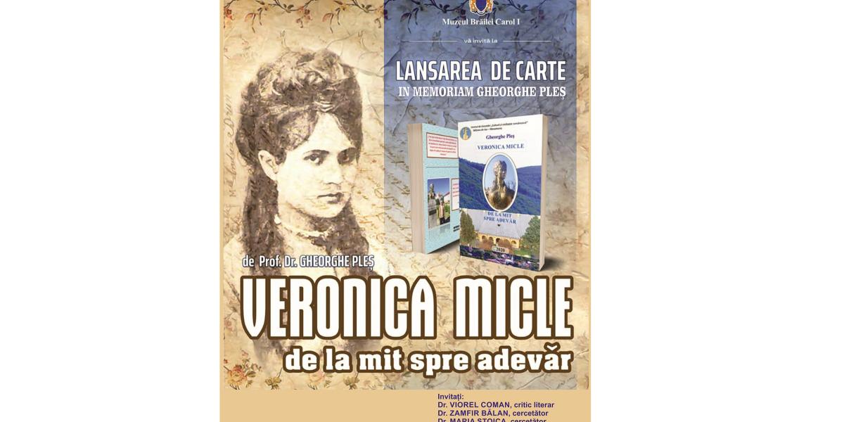 Astfel, potrivit comunicatului remis de prestigioasa instituție, iubitorii de literatură și nu numai sunt invitați joi, 20 mai, ora 18.00, în Sala "Regele Ferdinand I și Regina Maria" a Muzeului Brăilei "Carol I" (Piața Traian nr. 3) la lansarea cărții "Veronica Micle/ de la mit spre adevăr", autor fiind regretatul prof. Gheorghe Pleș. Invitați la eveniment: dr. Viorel Coman, critic literar; Dr. Zamfir Bălan, cercetător; Dr. Maria Stoica, șef Secție Artă a Muzeului Brăilei "Carol I".