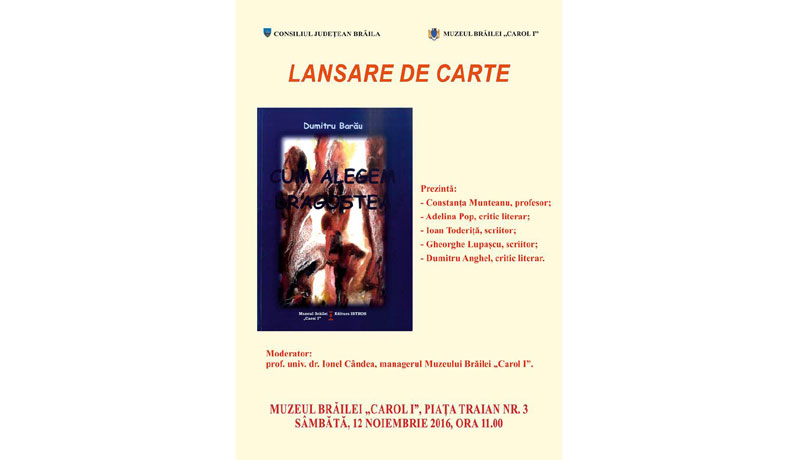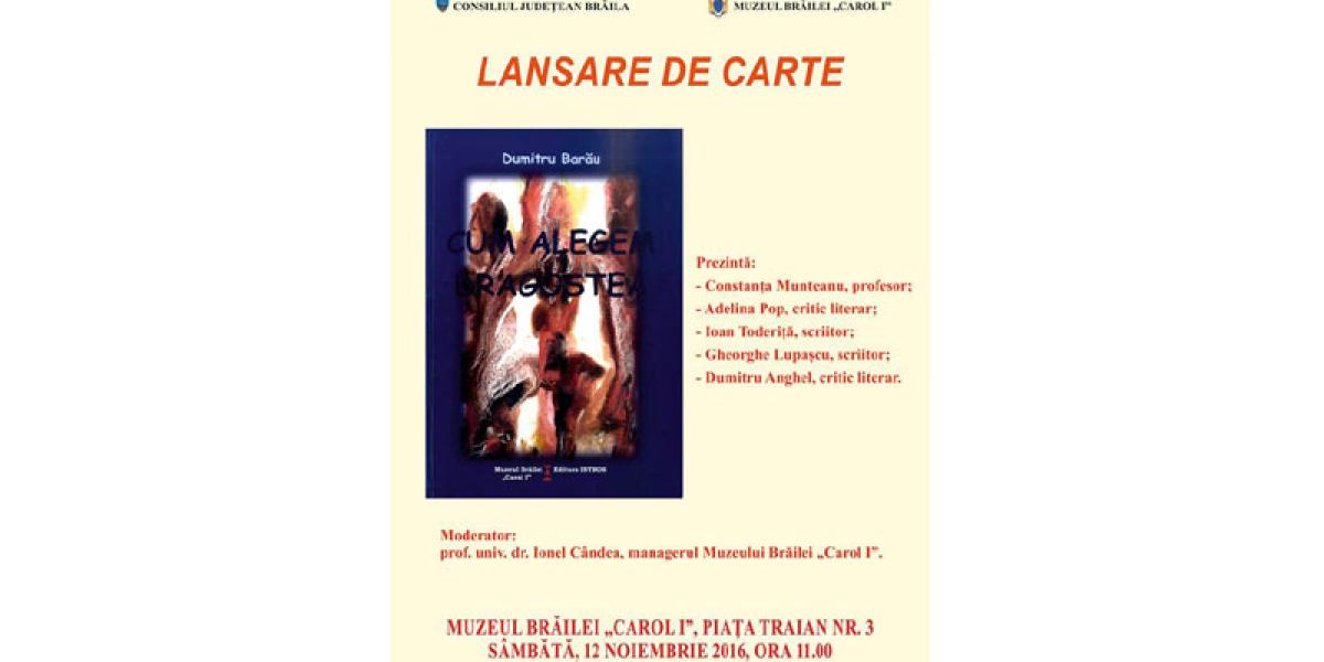 Sâmbătă, 12 noiembrie 2016, de la ora 11, în sala de conferinţe a Muzeului Brăilei „Carol I”, din Piaţa Traian nr. 3, va avea loc lansarea romanului „Cum alegem dragostea?”, autor Dumitru Barău, volum apărut la Editura Istros a Muzeului Brăilei „Carol I”. Evenimentul va fi prezentat de prof. Constanţa Munteanu, Adelina Pop - critic literar; Ioan Toderiţă - scriitor; Gheorghe Lupaşcu - scriitor; Dumitru Anghel - critic literar şi moderat de prof. univ. dr. Ionel Cândea, managerul Muzeului Brăilei „Carol I”.