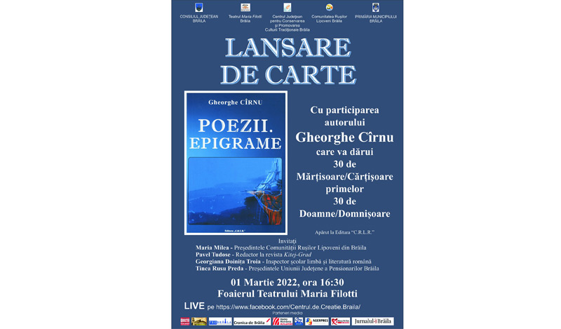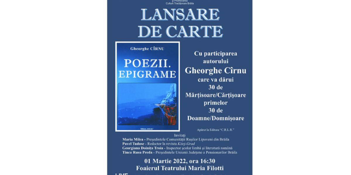 Astfel, potrivit unui comunicat trimis de organizatori, Consiliul Județean, Primăria Municipiului Brăila, Centrul Județean pentru Conservarea și Promovarea Culturii Tradiționale (Centrul de Creație) și Comunitatea Rușilor Lipoveni din Brăila îi invită pe brăileni să ia parte astăzi, 1 martie 2022, începând cu ora 16.30, în Foaierul Teatrului "Maria Filotti", la lansarea volumului "Poezii. Epigrame" semnată de Gheorghe Cîrnu, volum "dedicat tuturor pasionaților de lectură și entuziaștilor, tuturor celor care nu se dau înapoi să ofere cărților câteva ore din viața lor".