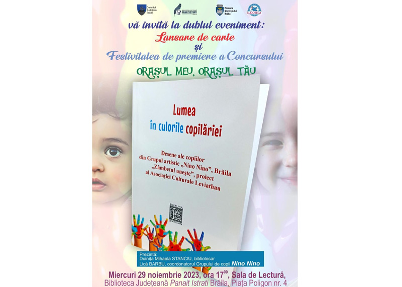 ”Vă invităm miercuri, 29 noiembrie 2023, începând cu ora 17.00, la Sala de Lectură a Bibliotecii Județene «Panait Istrati » la lansarea acestei cărți - un album cu desene care s-au bucurat de multe aprecieri din partea unor artiști plastici brăileni. Cu acest prilej are loc și Festivitatea de premiere a câștigătorilor Concursului de desene și compuneri «Orașul tău, orașul meu », desfășurat la Ludotecă în perioada octombrie – noiembrie , coordonat de Doinița Stanciu, bibliotecar. Vă așteptăm cu drag să ne bucurăm de lucrările copiilor noștri din Brăila!”, transmit organizatorii.