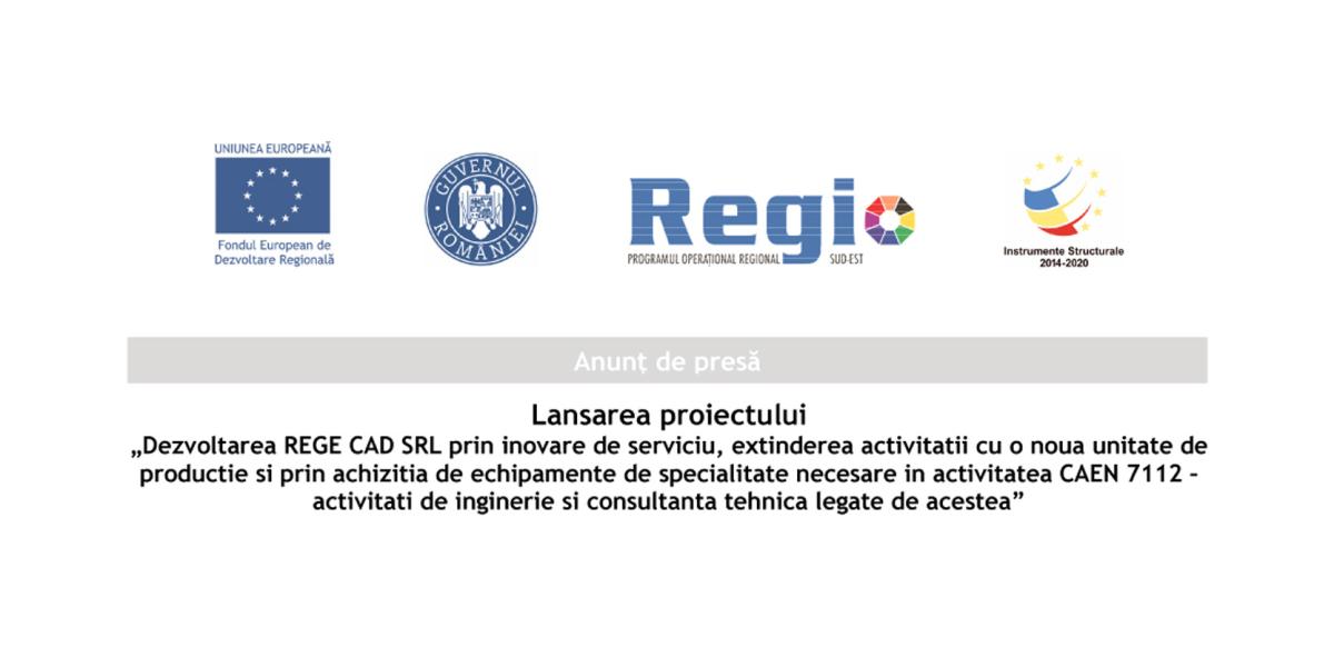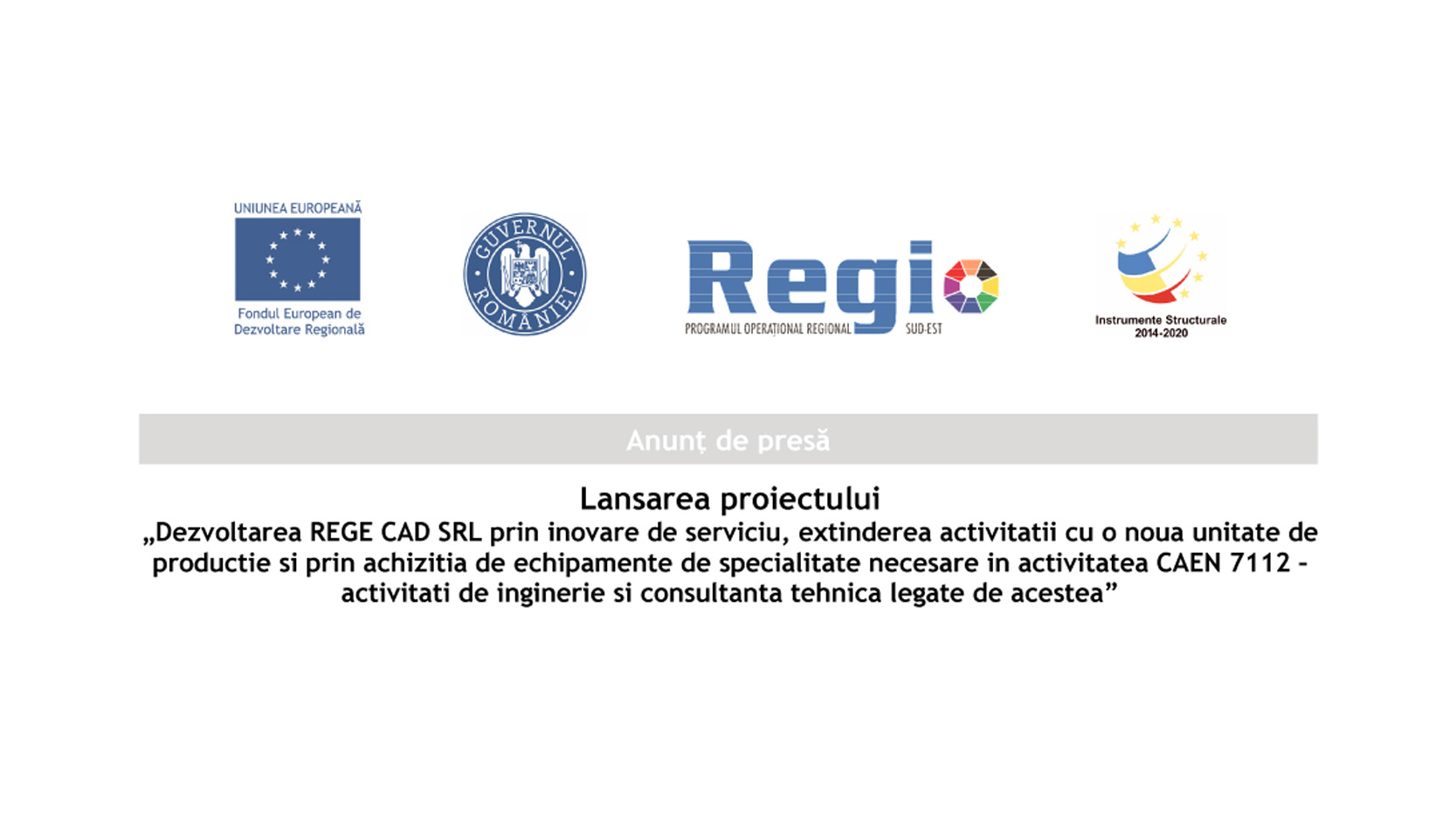REGE CAD S.R.L. este beneficiarul proiectului „Dezvoltarea REGE CAD SRL prin inovare de serviciu, extinderea activitatii cu o noua unitate de productie si prin achizitia de echipamente de specialitate necesare in activitatea CAEN 7112 –activitati de inginerie si consultanta tehnica legate de acestea” cod SMIS 109327, finanţat prin Programul Operaţional Regional 2014-2020, Axa prioritară 2: “Imbunătăţirea competitivităţii intreprinderilor mici si mijlocii”, Prioritatea de investiţii 2.1: “Promovarea spiritului antreprenorial, în special prin facilitarea exploatării economice a ideilor noi şi prin încurajarea creării de noi întreprinderi, inclusiv prin incubatoare de afaceri”.