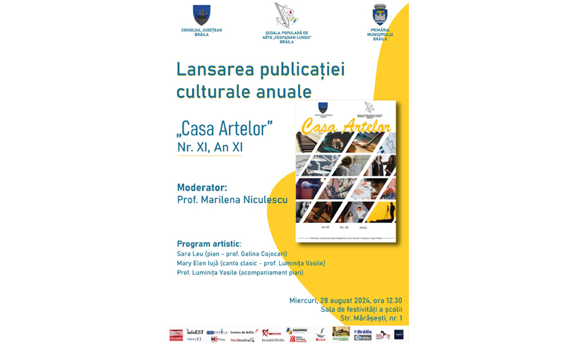 Potrivit comunicatului trimis de managerul instituției, Geanina Valentina Onodi, Școala Populară de Arte și Meserii „Vespasian Lungu” Brăila, cu sprijinul Consiliului Județean și al Primăriei Municipiului Brăila, invită publicul brăilean la lansarea publicației culturale anuale intitulată „Casa Artelor” (numărul XI, anul XI). Evenimentul va avea loc în ziua de miercuri, 28 august, începând cu ora 12.30, în Sala de festivități a Școlii de Arte „Vespasian Lungu”, din Strada Mărășești nr. 1.