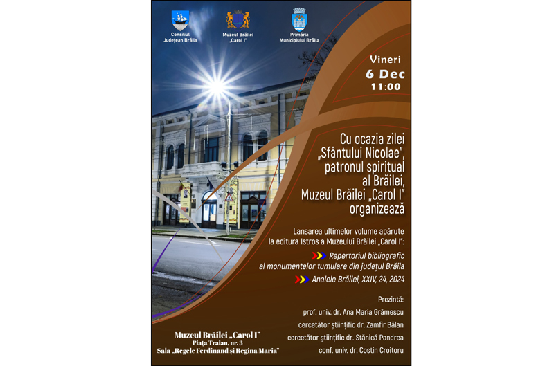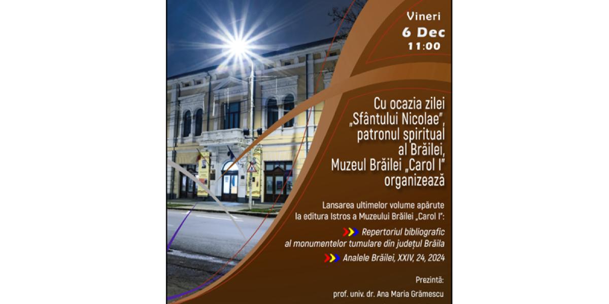 Cu prilejul sărbătorii Sfântului Ierarh Nicolae, patronul spiritual al Municipiului Brăila, Muzeul Brăilei „Carol I” organizează vineri, 6 decembrie, de la ora 11:00, la sediul central din Piața Traian nr. 3, Sala „Regele Ferdinand I și Regina Maria”, lansarea ultimelor două volume apărute, anul acesta, la Editura Istros a Muzeului Brăilei „Carol I”. Este vorba de „Repertoriul bibliografic al monumentelor tumulare din județul Brăila”, autor conf. univ. dr. Costin Croitoru, și publicația periodică Analele Brăilei, serie nouă, XXIV, nr. 24, 2024.