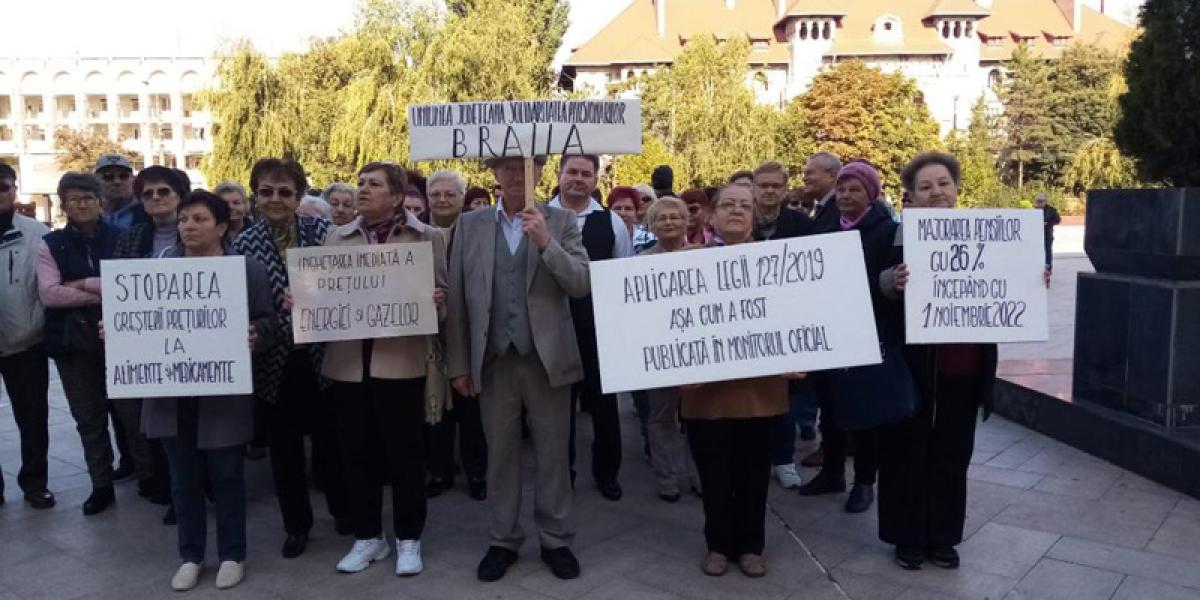 Ieri, 11 octombrie, între orele 10.00 – 11.30, peste 130 de pensionari au protestat în fața prefecturii, în legătură cu majorarea pensiilor, indexarea acestora și problemele create de creșterea alarmantă a tarifelor la energia electrică și gaze naturale. Acțiuni precum cea de la Brăila au avut loc în toată țara, la inițiativa federațiilor naționale reprezentative ale pensionarilor din România. La Brăila, pensionarii protestatari au fost de la Uniunea Județeană “Solidaritatea” Pensionarilor (Viorica Novac, președinte), Asociația Județeană “Demnitatea” Pensionarilor (Lenuța Constantinescu, președinte) și Uniunea Județeană a Pensionarilor (Tinca Rusu, președinte). Iar după cum ne-a declarat dna Viorica Novac , Venită la protest cu peste 100 de pensionari, Viorica Novac de la “Solidaritatea” ne-a declarat că s-au solicitat următoarele: majorarea pensiilor cu 26 % din luna noiembrie, creșterea punctului de pensie la 1840 lei, dar și măsuri de consolidare a bugetului asigurărilor sociale de stat, precum și indexarea pensiilor potrivit Legii nr.23/2010. De asemenea, în nume personal, Viorica Novac a propus “acordarea de gratuități la transportul CFR și cu mijloacele de transport în comun, venindu-se astfel în sprijinul persoanelor în vârstă de peste 70 de ani, puțin deplasabile și nevoite să ajungă la medic și diverse tratamente”.