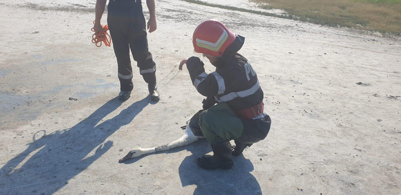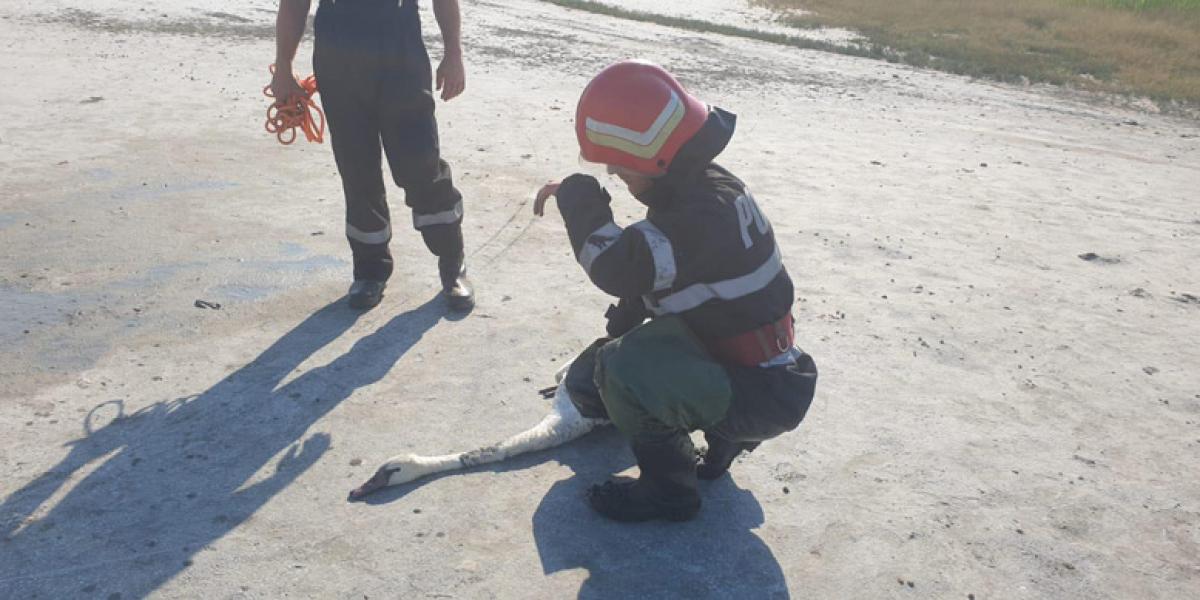 Luni dimineaţă, în jurul orei 8.30, pompierii din Brăila au acţionat pentru a scoate pasărea care rămăsese prinsă în nămol, într-o zonă din Lacul Sărat. Câţiva oameni aflaţi în zona plajei au observat lebăda şi au anunţat autorităţile.