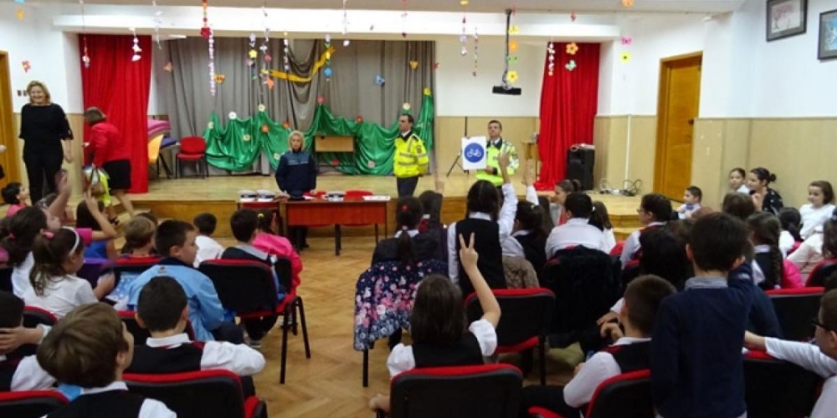 Acţiunea de vineri a Poliţiei Rutiere s-a mutat din stradă în şcoli. Lucrătorii IPJ s-au "transformat" în profesori şi au ţinut elevilor o lecţie interactivă despre siguranţa pietonilor. Cum la baza acestui comportament rutier preventiv stă cunoaşterea indicatoarelor rutiere, lecţia s-a desfăşurat în jurul acestui aspect. Astfel, poliţiştii le-au explicat elevilor că dacă semaforul este "galben intermitent", asta nu înseamnă că s-a defectat aparatul, aşa cum au sugerat şcolarii, ci trebuie să ne asigurăm temeinic înainte de a trece strada. De asemenea, copiii au înţeles că şoseaua nu e loc de joacă şi că e mai importantă viaţa lor decât o minge ajunsă în faţa maşinilor.