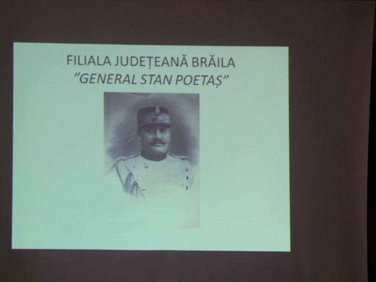 Col. (r) Ionel Teodorescu a prezentat un filmuleţ despre vizita unei delegaţii brăilene în ziua de 13 martie 2018 în Republica Moldova, la Soroca, unde s-a sfinţit Troiţa, adică piatra funerară dedicată eroului Stan Poetaş. Lt. col. Constantin Giurgea a vorbit despre viaţa generalului Poetaş.