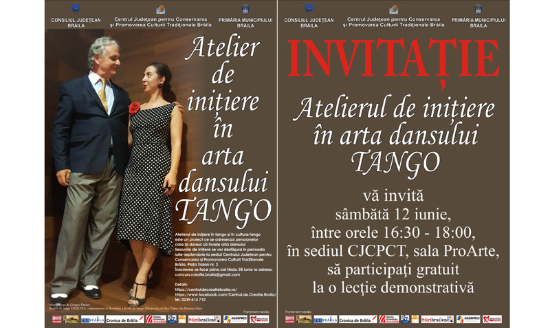 Centrul Județean pentru Conservarea și Promovarea Culturii Tradiționale Brăila (CJCPCT) - Centrul de Creație, ConsiliulJudețean și Primăria Municipiului Brăila îi invită pe brăileni în ziua de sâmbătă, 12 iunie, între orele 16.30-18.00, în Sala ProArte a instituției din Piața Traian nr. 2, la o lecție demonstrativă de dans (Tango). Participarea este gratuită.