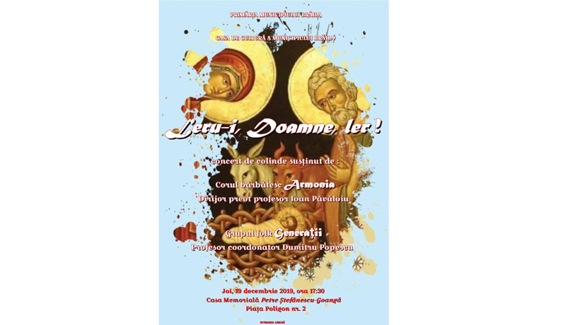 Joi, 19 decembrie 2019, de la ora 17.30, la Casa Memorială “Petre Ştefănescu-Goangă” va avea loc tradiţionalul Concert de Crăciun, în aşteptarea luminosului praznic al Naşterii Domnului.