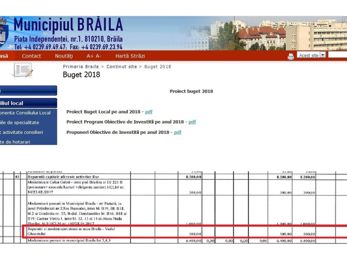 Cert este că în cadrul proiectului de buget postat în dezbatere publică pe site-ul Primăriei, apare într-adevăr şi punctul “Reparaţii şi modernizări străzi în municipiul Brăila - Vadul Ghecetului”, la capitolul “Reparaţii capitale aferente activelor fixe” - cu suma de 500.000 lei de la bugetul local.