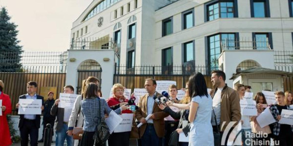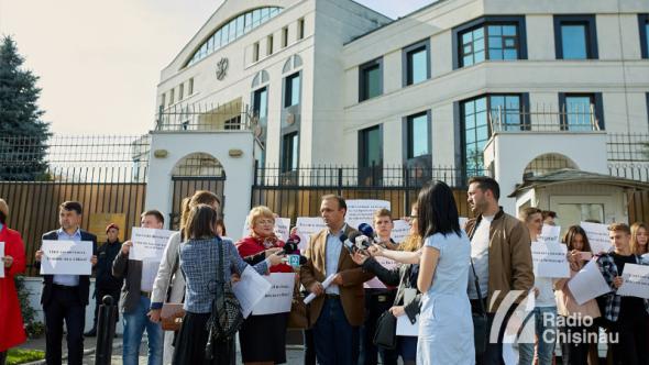 Un grup de elevi și profesori de la Liceul Teoretic „Ștefan cel Mare și Sfânt” cu predare în limba română din Grigoriopol, regiunea separatistă transnistreană, împreună cu Asociația Promo-LEX, au protestat, joi, în fața Ambasadei Federației Ruse la Chișinău.