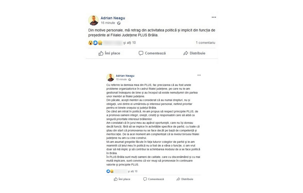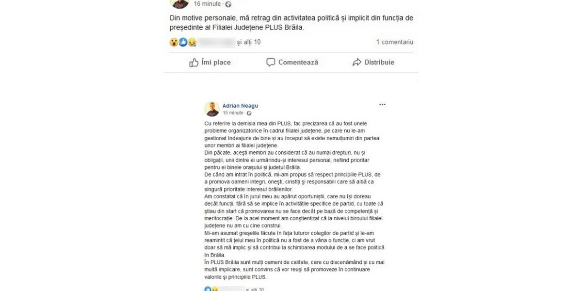 * acesta a postat încă de dimineață, un mesaj foarte scurt pe rețelele de socializare, privind demisia sa din funcția de președinte al PLUS Brăila, dar și din viața politică * ulterior, Adrian Neagu a revenit cu o postare în care a precizat că au existat anumite nemulțumiri ale unor membri, și a vorbit totodată despre "oportuniști" * contactat telefonic pentru a vedea cine va prelua șefia PLUS Brăila, Marcel Cucu, membru în Biroul Județean, a precizat că aspectul urmează să fie dezbătut în cadrul unei ședințe la partid
